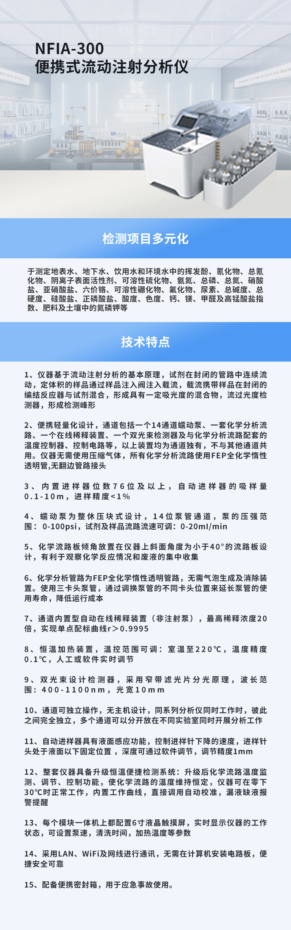 NFIA-300 便攜式流動(dòng)注射分析儀檢測(cè)項(xiàng)目:于測(cè)定地表水、地下水、用水和環(huán)境水中的揮發(fā)酚、氰化物、總氰化物、陰離子表面活性劑、性硫化物、氨氮、總磷、總氮、硝酸鹽、亞硝酸鹽、六價(jià)鉻、可溶性物、氟化物、尿素、總堿度、總硬度、硅酸鹽、正磷酸鹽、酸度、色鈣、鎂、甲醛及高錳酸鹽指數(shù)、肥料及士壤中的氮磷鉀等